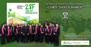 El Coro “Santa María” de Coria del Río participa el próximo sábado 28 de febrero, a partir de las 11:30 h, en la Sala de Audiovisuales del Museo de la Autonomía, con un programa de obras corales basadas en textos de poetas andaluces, culminando con la interpretación del Himno de Andalucía en la versión coral de Sergio Asián.